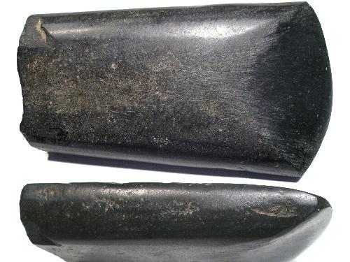 Neolithikum, Java. Allseitig geschliffene Steinbeilklinge mit Hohlschliff an der Schneide. Im Schäftungsbereich ist die Oberfläche der Stirnfläche geschliffen. Abmessungen (LxBxD): 59x55x14 mm Gewicht: 115 g |